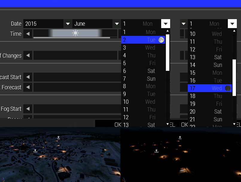 Also through this menu you can change what phase the moon is in. This gives you control over how dark your nights are. Light levels at night are also effected by the overcast setting.