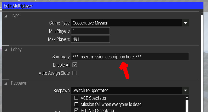 To change the mission description that is visible during slotting, go to Attributes -> Multiplayer -> Summary. Whatever you type into this box will be visible during slotting. This is typically where you'd put a quick blurb about the mission. It can be as simple as “Marines eliminate Insurgents”. That’s all that’s required from a description, but feel free to include any other important (and relevant) information such as required assets or weird quirks. If you don’t specify a slot as required then be aware that leadership may not take it.